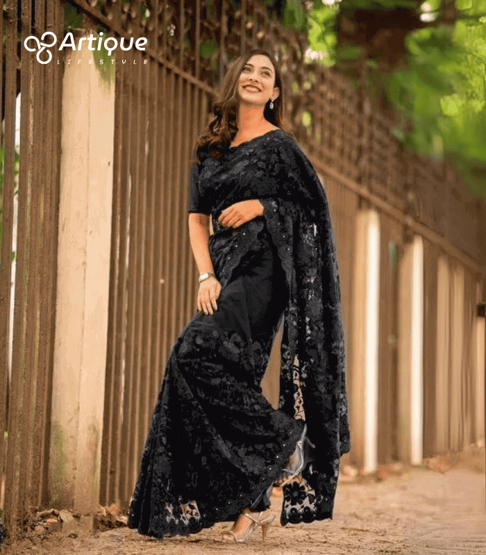এই কালো কালারের শাড়ি টি চিনিগুঁড়া ফ্যাব্রিক দিয়ে তৈরী করা এবং সম্পূর্ণ শাড়ির আঁচল ও কুঁচি জুড়ে কালো কালার সুতার এমব্রয়ডারি কাজ এটিকে আরও আকর্ষণীয় করে তোলে এবং যেকোনো বিশেষ অনুষ্ঠানের পরিধানের জন্য উপযুক্ত।