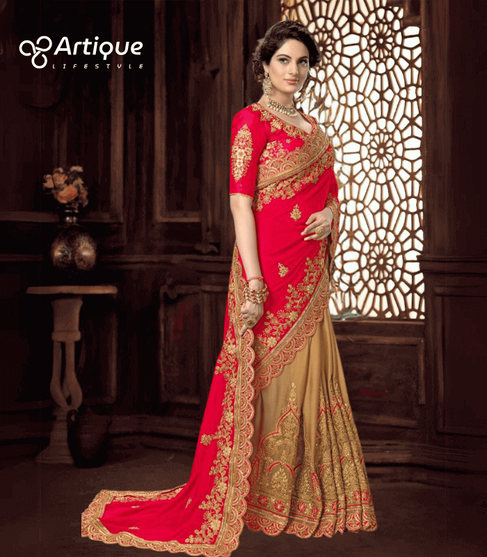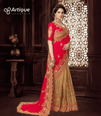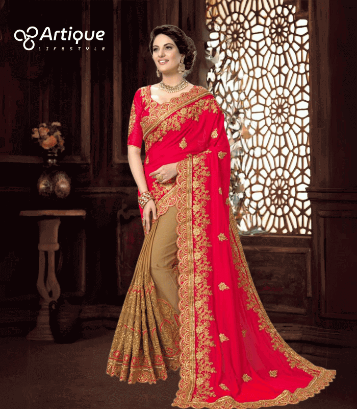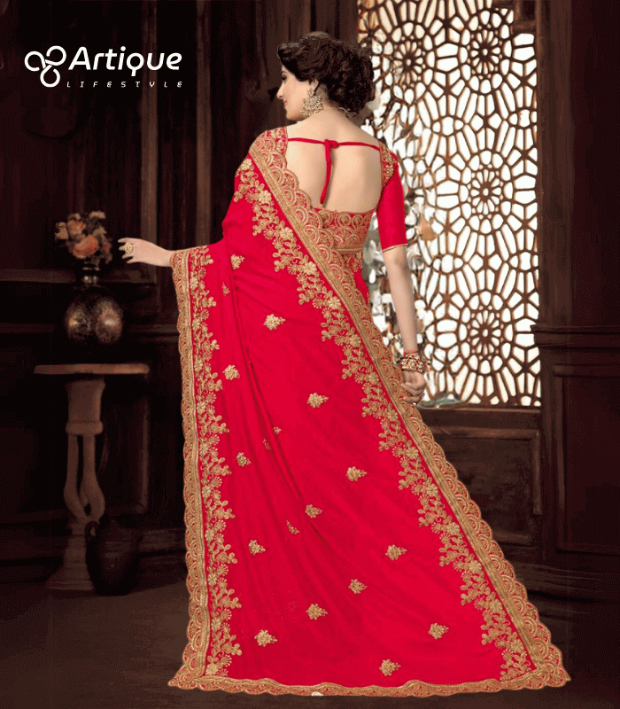 এই পিংক রেড কালারের শাড়ি টি ইন্ডিয়ান ওয়েটলেস সফট জর্জেট ফ্যাব্রিক দিয়ে তৈরী করা এবং সম্পূর্ণ শাড়ির আঁচল ও কুঁচি জুড়ে গোল্ডেন ও রেড কালার সুতার এমব্রয়ডারি কাজ এটিকে আরও আকর্ষণীয় করে তোলে এবং যেকোনো বিশেষ অনুষ্ঠানের পরিধানের জন্য উপযুক্ত।