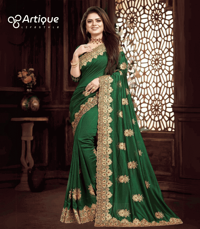 এই সবুজ কালারের শাড়ি টি ইন্ডিয়ান বিচিত্রা সিল্কের ফ্যাব্রিক দিয়ে তৈরী করা এবং সম্পূর্ণ শাড়ির আঁচল ও কুঁচি জুড়ে গোল্ডেন ও লাল কালার সুতার এমব্রয়ডারি কাজ এটিকে আরও আকর্ষণীয় করে তোলে এবং যেকোনো বিশেষ অনুষ্ঠানের পরিধানের জন্য উপযুক্ত।