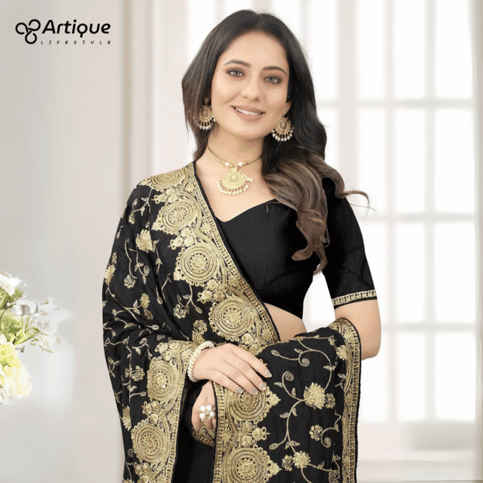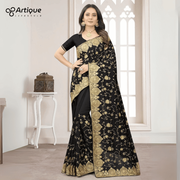 এই কালো কালারের শাড়ি টি ইন্ডিয়ান বিচিত্রা সিল্কের ফেব্রিক দিয়ে তৈরী করা এবং সম্পূর্ণ শাড়ির আঁচল ও কুঁচি জুড়ে গোল্ডেন জরি কালার সুতার এমব্রয়ডারি কাজ এটিকে আরও আকর্ষণীয় করে তোলে এবং যেকোনো বিশেষ অনুষ্ঠানের পরিধানের জন্য উপযুক্ত।