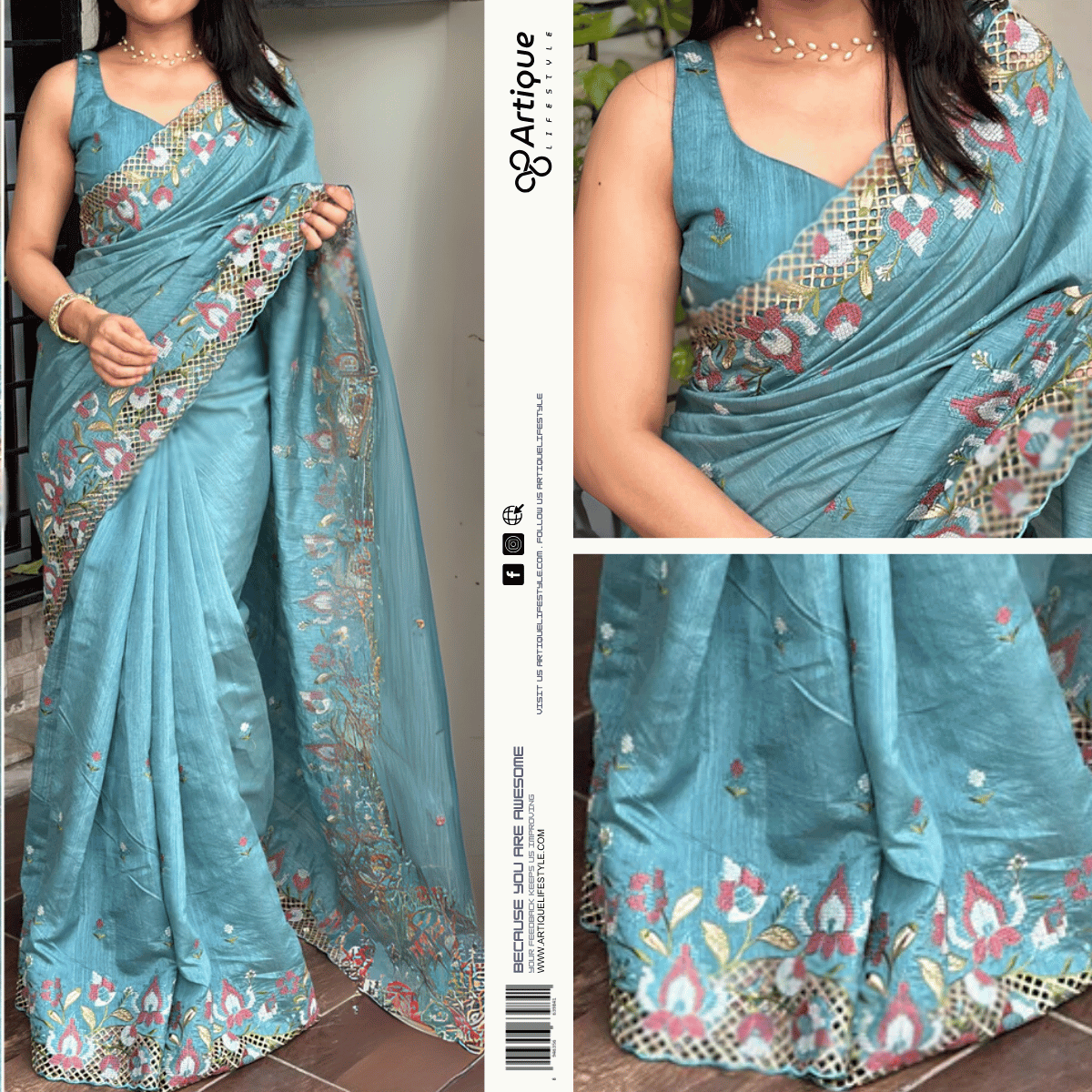 এই আকাশী কালারের শাড়ি টি ইন্ডিয়ান বিচিত্রা সিল্কের ফ্যাব্রিক দিয়ে তৈরী করা এবং সম্পূর্ণ শাড়ির আঁচল ও কুঁচি জুড়ে বিভিন্ন কালার সুতার এমব্রয়ডারি কাজ এটিকে আরও আকর্ষণীয় করে তোলে এবং যেকোনো বিশেষ অনুষ্ঠানের পরিধানের জন্য উপযুক্ত।