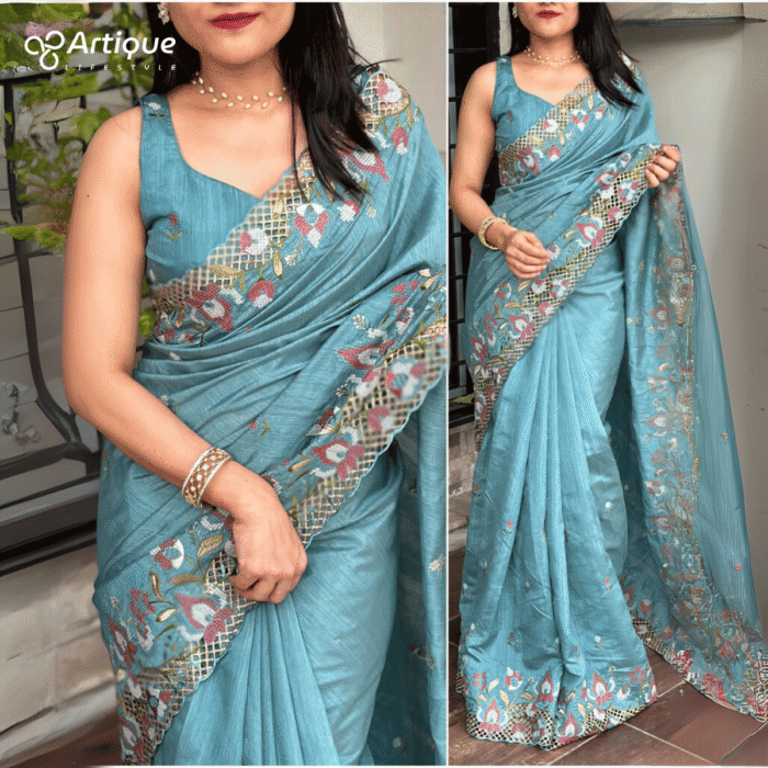 এই আকাশী কালারের শাড়ি টি ইন্ডিয়ান বিচিত্রা সিল্কের ফ্যাব্রিক দিয়ে তৈরী করা এবং সম্পূর্ণ শাড়ির আঁচল ও কুঁচি জুড়ে বিভিন্ন কালার সুতার এমব্রয়ডারি কাজ এটিকে আরও আকর্ষণীয় করে তোলে এবং যেকোনো বিশেষ অনুষ্ঠানের পরিধানের জন্য উপযুক্ত।