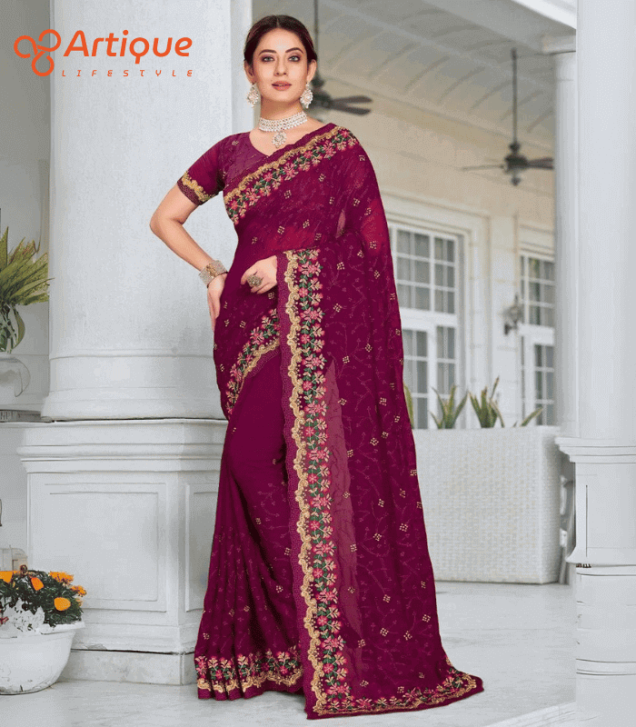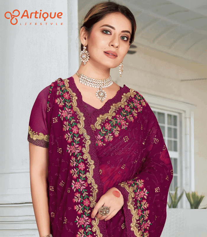 এই পার্পেল কালারের শাড়ি টি ইন্ডিয়ান ওয়েটলেস সফট চিনিগুড়া ফ্যাব্রিক দিয়ে তৈরী করা এবং সম্পূর্ণ শাড়ির আঁচল ও কুঁচি জুড়ে পার্পেল, লাল, সবুজ, গোল্ডেন কালার সুতার এমব্রয়ডারি কাজ এটিকে আরও আকর্ষণীয় করে তোলে এবং যেকোনো বিশেষ অনুষ্ঠানের পরিধানের জন্য উপযুক্ত।