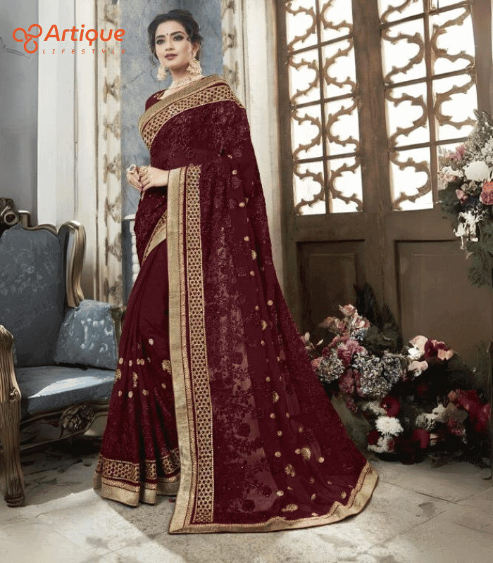 এই ওয়াইন কালারের শাড়ি টি ইন্ডিয়ান ওয়েটলেস সফট জর্জেট ফ্যাব্রিক দিয়ে তৈরী করা এবং সম্পূর্ণ শাড়ির আঁচল ও কুঁচি জুড়ে নিখুঁত রেশমি সুতার লেইস এবং এমব্রয়ডারি কাজ এটিকে আরও আকর্ষণীয় করে তোলে এবং যেকোনো বিশেষ অনুষ্ঠানের পরিধানের জন্য উপযুক্ত।