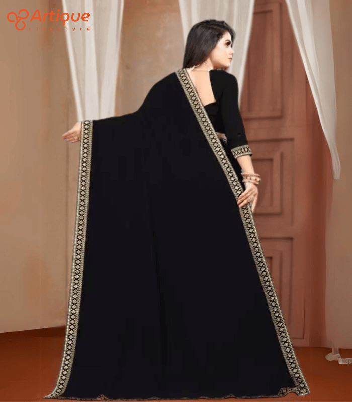 এই কালো কালারের শাড়ি টি ইন্ডিয়ান ওয়েটলেস সফট জর্জেট ফ্যাব্রিক দিয়ে তৈরী করা এবং সম্পূর্ণ শাড়ির আঁচল ও বর্ডার জুড়ে কনট্রাস্ট লেইস ওয়ার্ক এটিকে আরও আকর্ষণীয় করে তোলে এবং যেকোনো বিশেষ অনুষ্ঠানের পরিধানের জন্য উপযুক্ত।