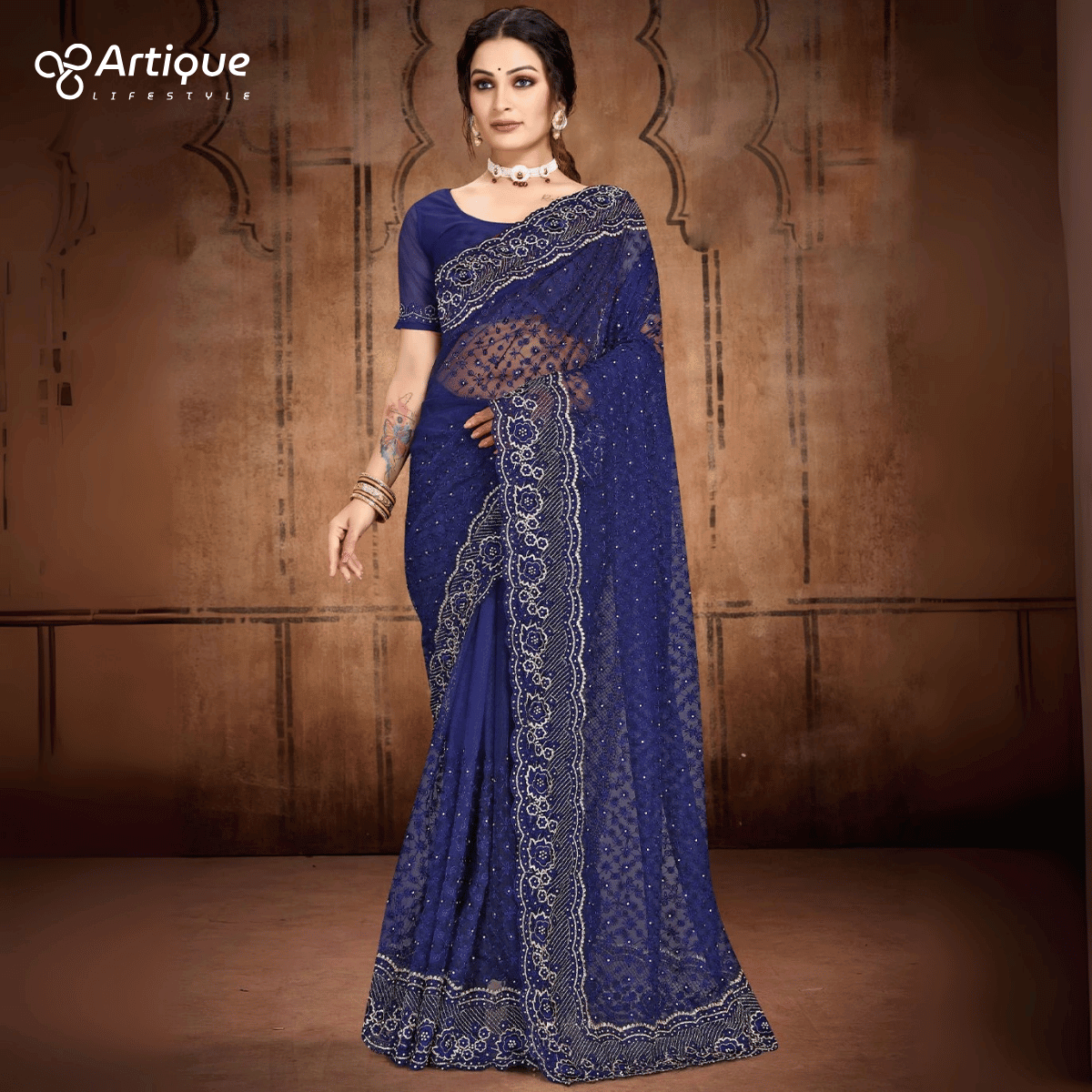এই নেভি ব্লু কালারের শাড়ি টি প্রিমিয়াম অর্গানজা ফ্যাব্রিক দিয়ে তৈরী করা এবং সম্পূর্ণ শাড়ির আঁচল ও কুঁচি জুড়ে নেভি ব্লু এবং সিলভার কালার জরি সুতার এমব্রয়ডারি কাজ এটিকে আরও আকর্ষণীয় করে তোলে এবং যেকোনো বিশেষ অনুষ্ঠানের পরিধানের জন্য উপযুক্ত।