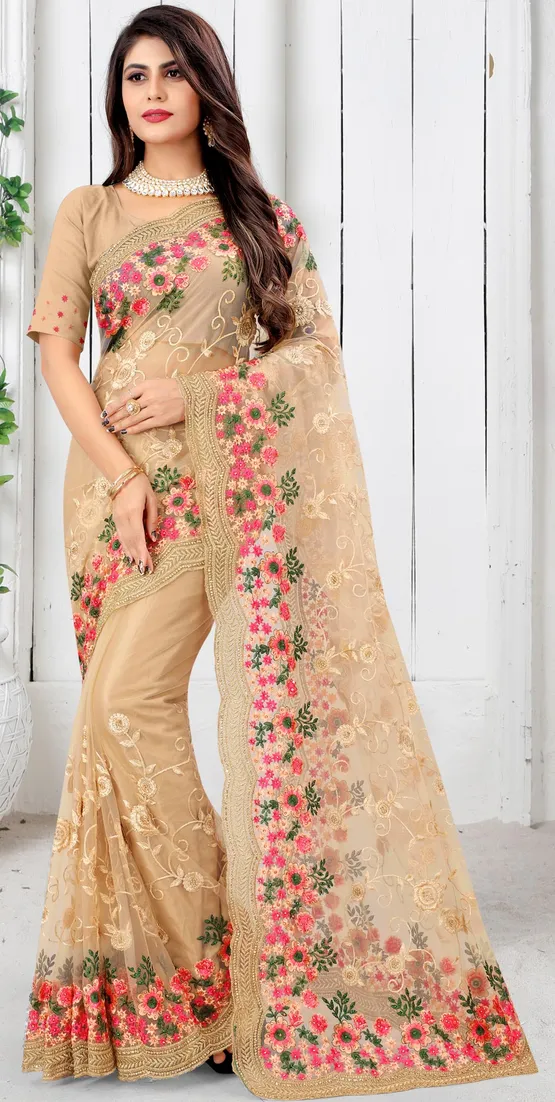 এই বিস্কুট কালারের শাড়ি টি প্রিমিয়াম অর্গানজা ফ্যাব্রিক দিয়ে তৈরী করা এবং সম্পূর্ণ শাড়ির আঁচল ও কুঁচি জুড়ে বাঙ্গি,মিষ্টি,সি গ্রীন, ম্যাচিং এবং জরি সুতার এমব্রয়ডারি কাজ এটিকে আরও আকর্ষণীয় করে তোলে এবং যেকোনো বিশেষ অনুষ্ঠানের পরিধানের জন্য উপযুক্ত।