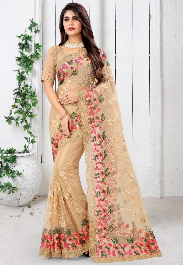 এই বিস্কুট কালারের শাড়ি টি প্রিমিয়াম অর্গানজা ফ্যাব্রিক দিয়ে তৈরী করা এবং সম্পূর্ণ শাড়ির আঁচল ও কুঁচি জুড়ে বাঙ্গি,মিষ্টি,সি গ্রীন, ম্যাচিং এবং জরি সুতার এমব্রয়ডারি কাজ এটিকে আরও আকর্ষণীয় করে তোলে এবং যেকোনো বিশেষ অনুষ্ঠানের পরিধানের জন্য উপযুক্ত।