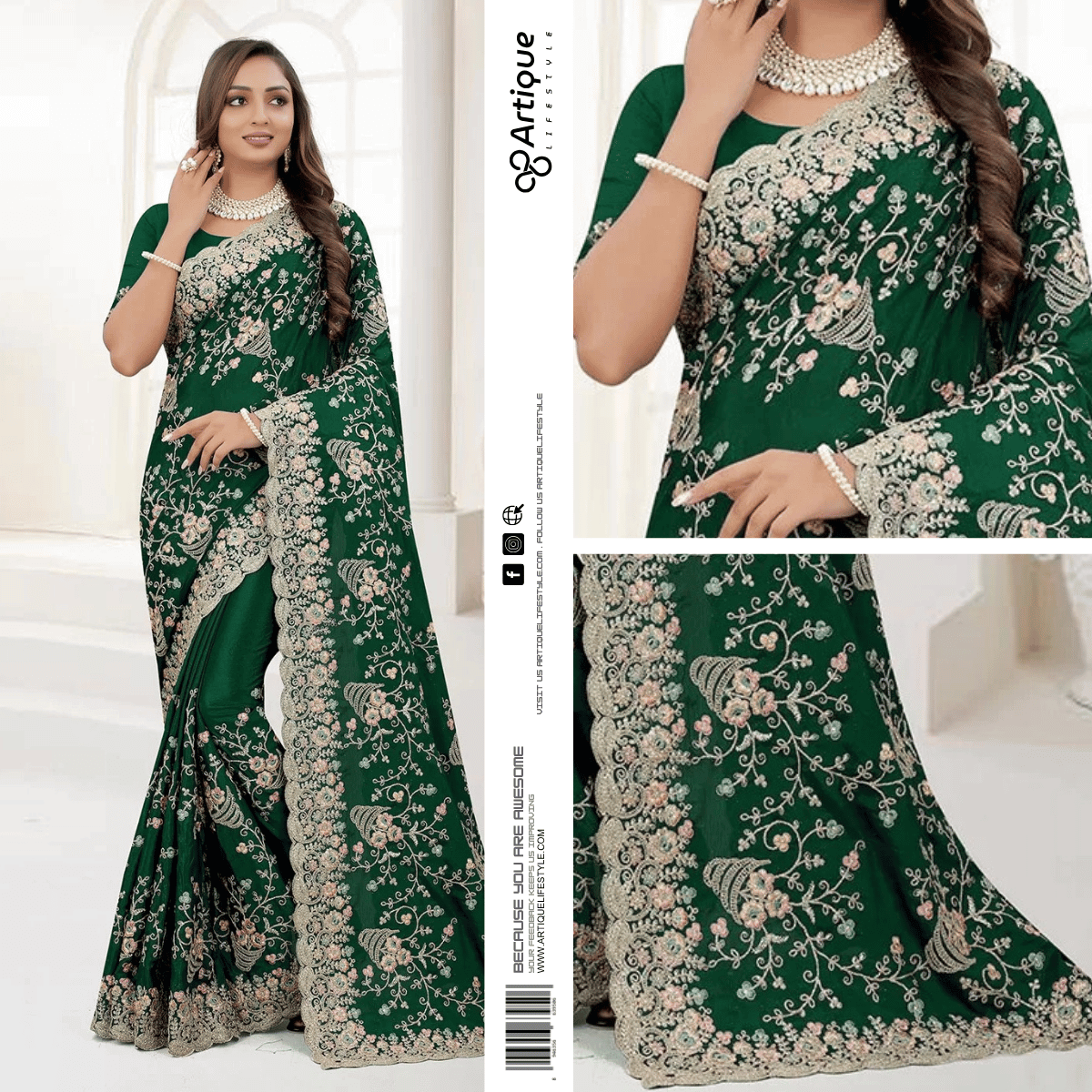 এই বোটল গ্রিন কালারের শাড়ি টি প্রিমিয়াম বিচিত্রা সিল্ক ফেব্রিক দিয়ে তৈরী করা এবং সম্পূর্ণ শাড়ির আঁচল ও কুঁচি জুড়ে সিলভার, গোলাপি, হালকা পেষ্ট কালার সুতার এমব্রয়ডারি কাজ এটিকে আরও আকর্ষণীয় করে তোলে এবং যেকোনো বিশেষ অনুষ্ঠানের পরিধানের জন্য উপযুক্ত।