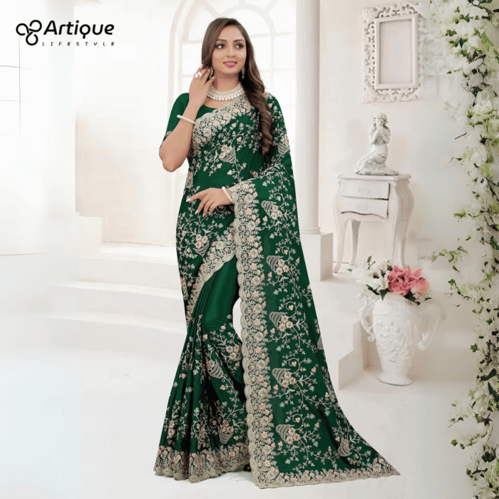 এই বোটল গ্রিন কালারের শাড়ি টি প্রিমিয়াম বিচিত্রা সিল্ক ফেব্রিক দিয়ে তৈরী করা এবং সম্পূর্ণ শাড়ির আঁচল ও কুঁচি জুড়ে সিলভার, গোলাপি, হালকা পেষ্ট কালার সুতার এমব্রয়ডারি কাজ এটিকে আরও আকর্ষণীয় করে তোলে এবং যেকোনো বিশেষ অনুষ্ঠানের পরিধানের জন্য উপযুক্ত।